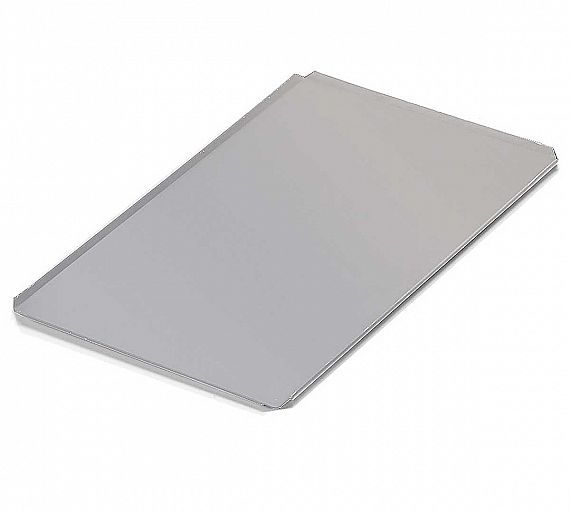 Bandeja fabricada en acero inoxidable de superficie lisa para hornear carnes, pescados, empanadas, bollería, pasteles o pan.