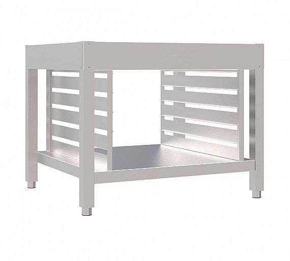 El Soporte Bajo con Guías GN de Mychef, es una estructura apta para colocar apilados los hornos con capacidad de 4 GN 1/1 o individualmente los de 10 GN. Sus 5 ranuras de inserción permiten almacenar bandejas GN ya sean limpias, preparadas o usadas.